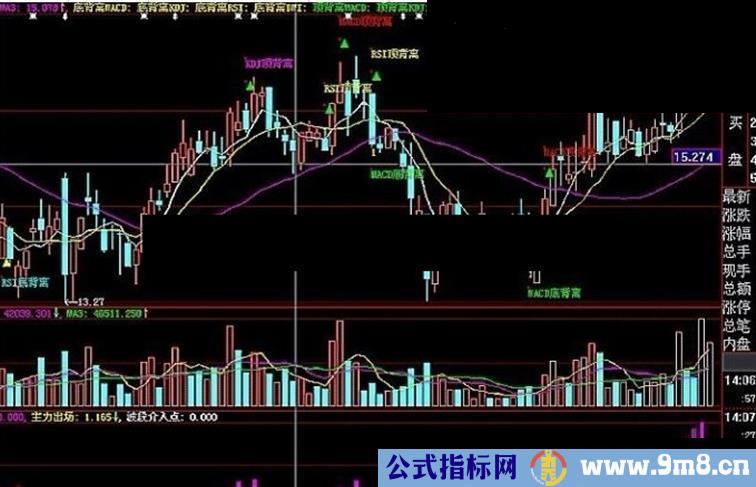 DRAWTEXT(FILTER(D3>0,5),HIGH*1.04,'RSI顶背离'),coloryellow;
