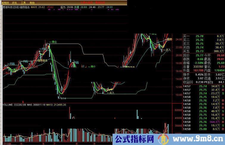 DRAWTEXT(加仓 ,LOW*0.98,'←加仓'),COLORRED; JC:=CROSS(0,五日乖离率) AND 三拾日乖离率REF(MA10,1) ; 减仓:=FILTER(JC,10); MR:=COUNT(CROSS(五日乖离率,0),3)>=1 AND 三拾日乖离率>REF(三拾日乖离率,1) AND MA05>REF(MA05,1) AND (C/REF(C,1)-1)*100>5 AND REF(C,1) 买入:=FILTER(MR,10); DRAWTEXT(减仓,HIGH*1.02,'←风险'),COLORCYAN; DRAWTEXT(买入,LOW*0.98,'←买入'),COLORYELLOW; DRAWTEXT(清仓 ,HIGH*1.02,'←清仓'),COLORGREEN; DRAWTEXT(强势狙击,LOW*0.98,'←强势狙击'),COLORYELLOW; VAR21:=MAX(ABS(HIGH-AMOUNT/VOL/100),ABS(AMOUNT/VOL/100-LOW)); VAR3:=ABS((OPEN+CLOSE)/2-AMOUNT/VOL/100); MV:=(VAR21+VAR3)/AMOUNT*VOL*100*50; 压力:MA(REF(HHV(C,30),1),2),COLOR9DFFFF; 支撑:MA(REF(LLV(C,30),1),2),COLORABFF46; MA(CLOSE,7),LINETHICK1,COLORFFFFFF;MA(CLOSE,10),LINETHICK1,COLOR00FFFF; MA(CLOSE,30),LINETHICK1,COLORFFFF00;