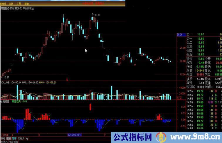 X_11:=IF(CLOSE>OPEN,X_10*(HIGH-LOW),IF(CLOSE X_14:=X_11/20/1.15; X_15:=X_14*0.55+REF(X_14,1)*0.33+REF(X_14,2)*0.22; X_16:=EMA(X_15,3); X_17:=X_16*1/10000; X_18:=EMA(X_17,5); X_19:=CROSS(X_17,X_18); STICKLINE((X_17 > X_18),X_17 - X_18,0,2,0),COLORRED; STICKLINE((X_17 < X_18),X_17 - X_18,0,2,0),COLORFF0000; 罪恶滔天:MA(X_17 - X_18,4),COLORGREEN,DOTLINE; 这个公式我只截取了原式的八行,后三行是我的。 为什么说是二货呢? 首先,原码二货。无论“一发千钧”还是那个“骂我的”。他们原本都来自一个公式——资金流量,而且照抄得有点傻(不思考)。要是我来抄至少是这样 X_11:=VOL/((HIGH-LOW)*2-ABS(CLOSE-OPEN))*(CLOSE-OPEN);......(具体分析见《抓住资金流量的尾巴》) 第二,从图形反应上看,有点二。我知道二货想把蓝翻红第一天作为压力与支撑画灰色条,然而他却不能把第一天包进去,这是他二的地方。另外,后面还有一段过滤5天连续信号,是想去掉一些杂音,然而反应也就变得迟钝啦! 至于,我的处理。1,让该红的红,该蓝的蓝,还其本真。至于后面的支撑压力自己判断!2,就加一根简单的均线,通过线与柱的关系定买卖,线与零轴的关系定是什么性质的买卖。 最后,就用一张图说明一下,让罪恶的人被救赎,哈利路亚!