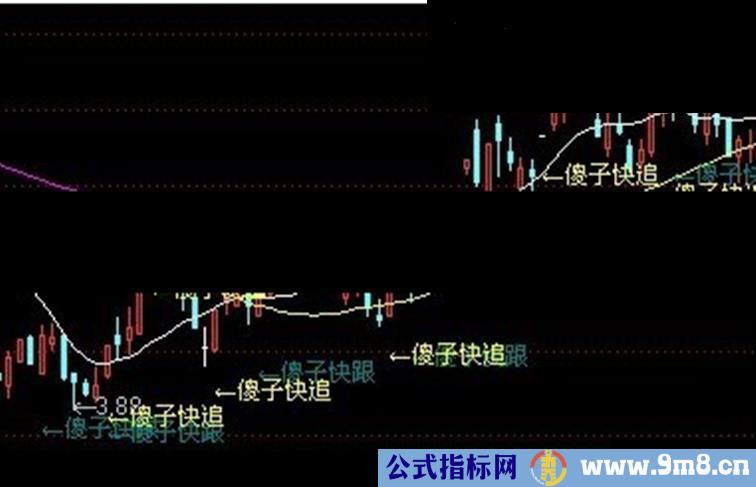 傻子快追:DRAWTEXT(VAR2>90,LOW*0.97,'←傻子快追'),COLORYELLOW;