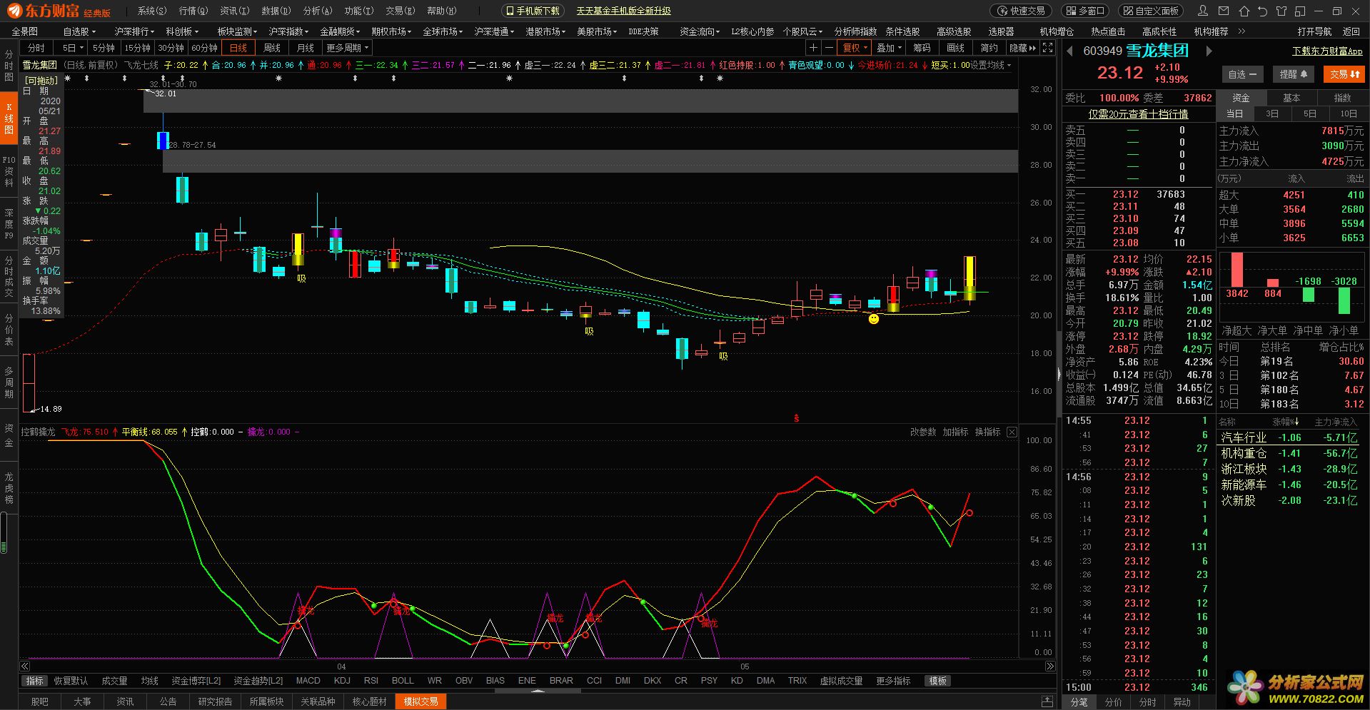控鹤擒龙本公式,是短线操盘公式。 公式用法解释: 控鹤=进入准备状态 擒龙=发起进攻 当飞龙线由绿转红时,要随时准备进入控鹤状态,只要看到飞龙线金叉平衡线出现红龙珠,可以择机买入 当飞龙线由红转绿时,要做好随时回撤的准备,只要看到飞龙线死叉平衡线出现绿龙珠,可以择机卖出或换手。分析家公式网 www.fxjgsw.com/一般东方财富能用的通达信都可以用,我用的指标是东方财富所以只针对东方财富指标,如果通达信用的要自己把代码复制后,新建一个副图指标 {控鹤擒龙} V3:=(CLOSE-LLV(LOW,8))/(HHV(HIGH,8)-LLV(LOW,8))*100; 飞龙:SMA(V3,2,1),COLORRED,LINETHICK2; 平衡线:SMA(飞龙,2,1),COLORYELLOW,LINETHICK1; 控鹤:IF(飞龙>REF(飞龙,1) AND REF(飞龙,1)<REF(飞龙,2) AND 飞龙<23 ,18,0),COLORWHITE,LINETHICK1; 擒龙:IF(飞龙>REF(飞龙,1) AND CROSS(飞龙,平衡线) AND 平衡线<50,30,0),COLORCC00CC; IF(飞龙<REF(飞龙,1),飞龙,DRAWNULL),COLORGREEN,LINETHICK2; DRAWTEXT(擒龙,H*1.005,'擒龙'),COLORRED; DRAWICON(CROSS(飞龙,平衡线),平衡线*1,13); DRAWICON(CROSS(平衡线,飞龙),平衡线*1,11);