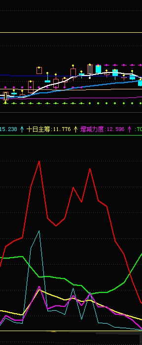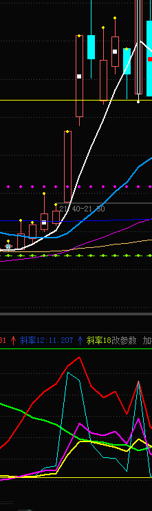 主力筹码上穿任何线都买进, GU1:=1; GU55:=LLV(LOW,8); GU66:=HHV(HIGH,8); GU77:=(GU66-GU55)/10; GU88:=SMA((CLOSE-GU55)/GU77,20,1); GUA:=3*GU88-2*SMA(GU88,15,1); 散筹集中度下穿红线买: (10-GUA)*GU1*6,colorgreen,LINETHICK2; 机筹集中度上穿绿买,主力筹码上穿绿坚决买:EMA(WINNER(C)*70,3),LINETHICK2,colorred; 主力筹码: 10*WINNER(CLOSE*0.9)*8, colorcyan; WWWFXJGSWCOM:=VOL/((HIGH-LOW)*2-ABS(CLOSE-OPEN)); 十日主筹:EMA(主力筹码,10),LINETHICK2,coloryellow; GU100:=(CLOSE-MA(CLOSE,34))/MA(CLOSE,34)*(10); 增减力度:GU100*6,colormagenta,LINETHICK2; {分析家公式网 WWW.fxjgsw.com 整理} 70,colorgreen ; 0,coloryellow ; X4:=EMA(C,6); 斜率6:(X4-REF(X4,1))/REF(X4,1)*100,LINETHICK0; X5:=EMA(C,12); 斜率12:(X5-REF(X5,1))/REF(X5,1)*100,LINETHICK0; X6:=EMA(C,18); 斜率18:(X6-REF(X6,1))/REF(X6,1)*100,LINETHICK0;