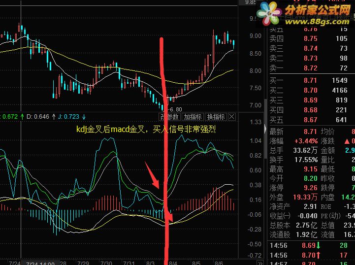 macd较慢,kdj较快,本公式仅仅是简单的放在一起,保证了原汁原味 用法,KDJ金叉后MACD金叉,是较强的买入信号 j>1为超买,j<0.2为超买,超买不适合进入,但是不代表不涨、超卖适合进入但是不代表补跌,这就需要macd的信号进行确认,多头还是空头行情, 具体不废话了,大家自行验证