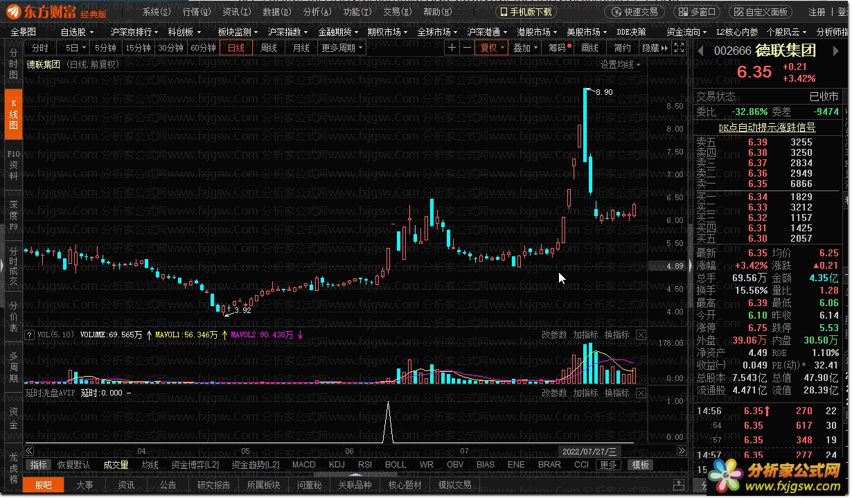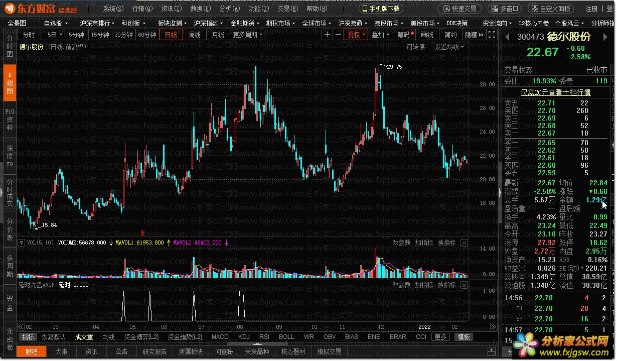 延时洗盘AVIP@东方财富软件适用 德圣通老师作品 延时洗盘SVIP,本指标为了答谢广大老夫的粉丝,特此开源源码展示给大家,喜欢的可以直接复制源码。当然要完整的延时洗盘源码肯定要下载里面的指标了! 附件里,有副图和选股。 X1:=COUNT((C/REF(C,1)>1.097 AND C==H OR C/REF(C,1)>1.175 AND C==H),40)>0 ; X2:=EXIst(C>(REF(HHV(C,40),10)),3) AND COUNT(C>(REF(HHV(C,40),10)),7)<=2 AND C/(REF(HHV(C,40),10))<1.06 AND LLV(C,7)<(REF(HHV(C,40),10)); 延时: X1 AND X2 AND MACD.dif>macd.DEA ;