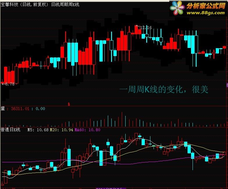这是第五次改进了,只有极其少数情形下的影线不对。。 STICKLINE(C>=O,L,H,0,0),COLORRED; STICKLINE(C>=O,C,O,3,1),COLORRED; STICKLINE(C<O,L,H,0,0),COLORCYAN; STICKLINE(C<O,C,O,3,0),COLORCYAN; M5:MA(C,5); M20:MA(C,20); MA60:MA(C,60);