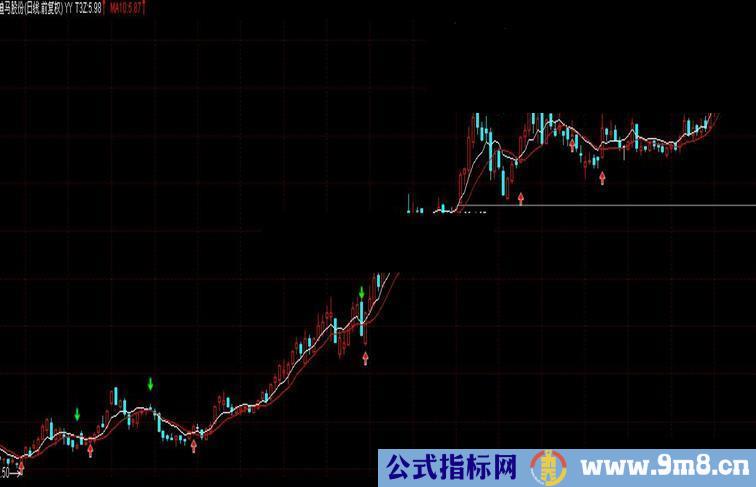 T3Z:(REF(C,7)+REF(C,6)+REF(C,5)+REF(C,4)+REF(C,3)+REF(C,2)+REF(C,1)+3.1*C)/10; MA10:MA(C,10),COLORRED; DRAWICON(CROSS(T3Z,MA10),LLV(L,10),1); DRAWICON(CROSS(MA10,T3Z),HHV(H,10),2);