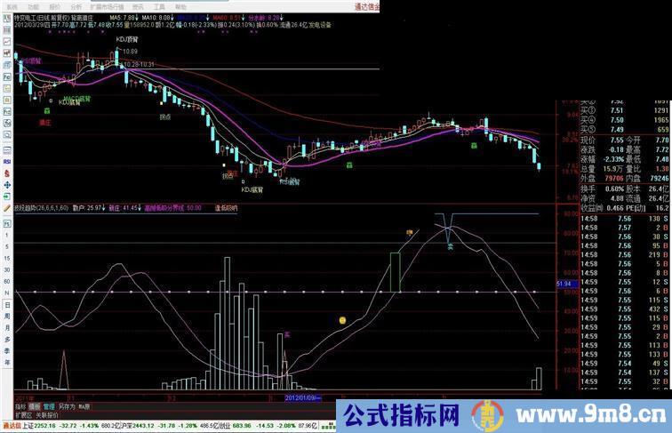 DRAWTEXT((CROSS(新庄,散户) AND (新庄 > 75)),75,'卖'),,COLORFFFF00;