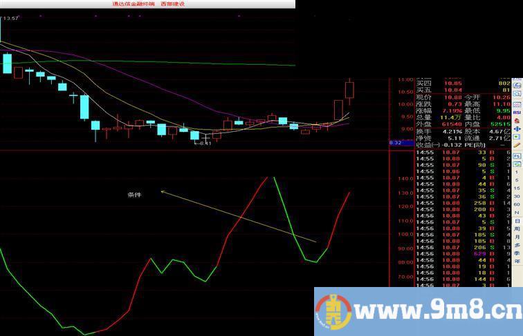 条件:请老师把副图的绿线变红线改成选股的公式。