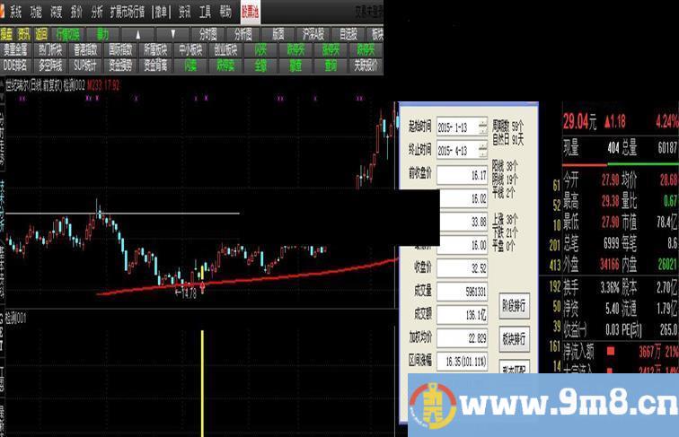 年线取233日移动平均线,为了防止假突破。取突破年线和成交量8日均量大于(或者上穿)21日均量后,收盘价大于233日线10个点以上为信号点。25150101到20150429共计出票33张,其中有些牛股了。