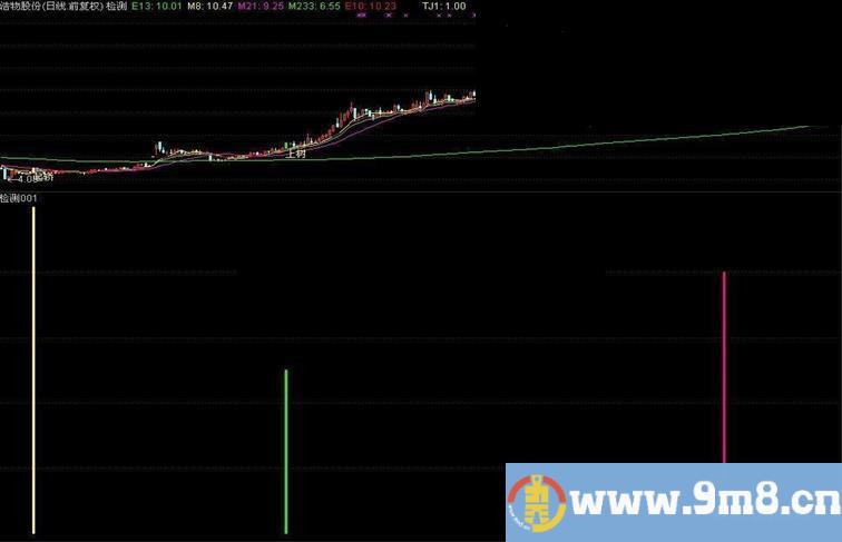 MXG:=REF(TJ,1) AND TJ1 AND TJ2>13 AND JD>72 AND REF(LL,1)<1.37 AND REF(HH,1)<11.15;