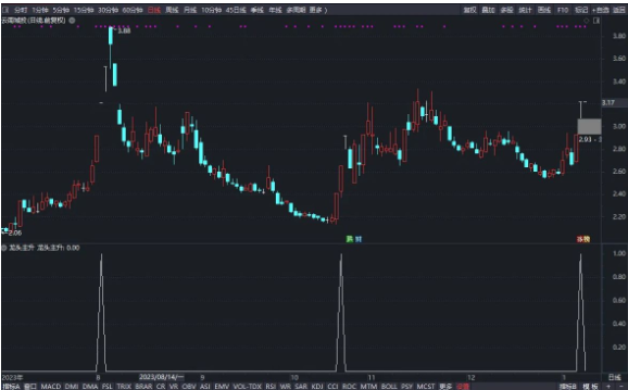 HJ_1:=C/REF(C,1)>=1.038 AND C=H;HJ_22:=COUNT(HJ_1,2)>=1 AND NOT(COUNT(HJ_1,3)>=2);HJ_23:=COUNT(HJ_1,3)>=2 AND NOT(COUNT(HJ_1,4)>=3);升:=FILTER(HJ_23,13),COLORGREEN;主升:=升 AND COUNT(升,18)=1;龙头主升:主升;