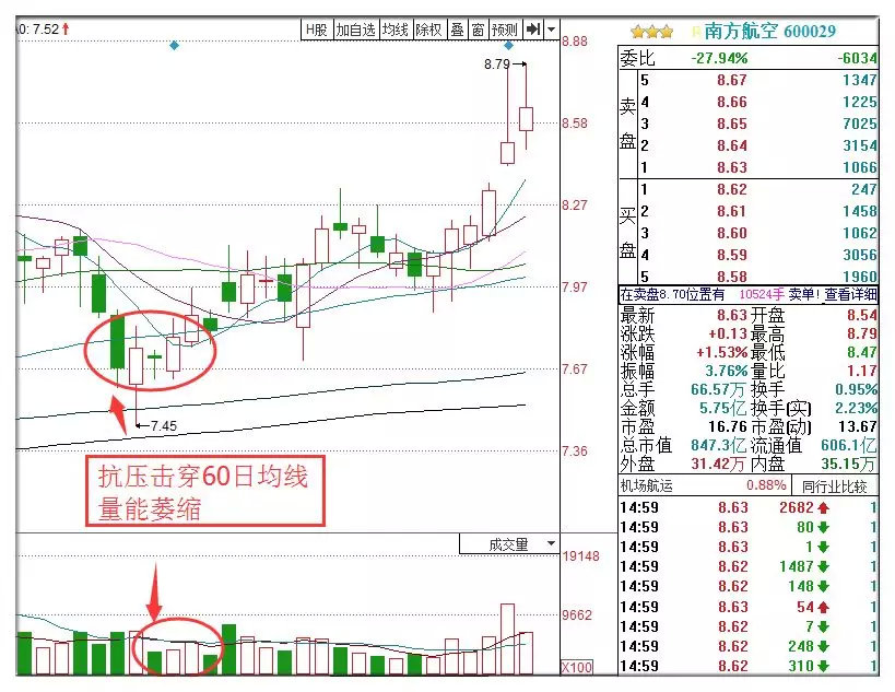 以南方航空(600029)为例,该股在回调至60日线附近之后猛烈打击,快速击穿60日线,但是在打压的过程中量能却是大幅萎缩的,随后快速收回60日线,明显的挖坑走势,挖坑结束后股价连续上涨。