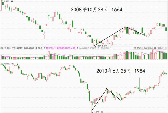 假底出现后直接快速拉升25%以上,无明显回调;而真实大底是复合型底部。