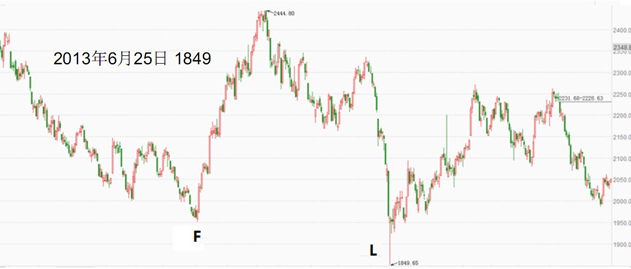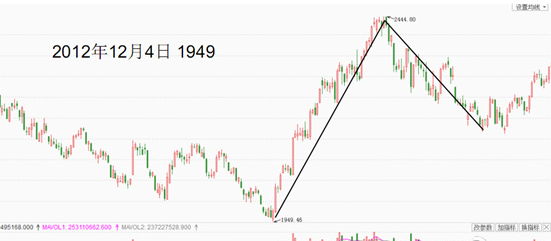 2012年12月4日1949位置出现V型底部反弹,但V型反弹顶点后出现大幅度下跌。