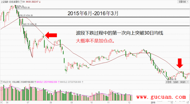 在下跌过程中,第一次反弹触及30日均线时,此处并不是趋势中好的金叉做多位置,盈亏比不高,至少不是个好的加仓位置。