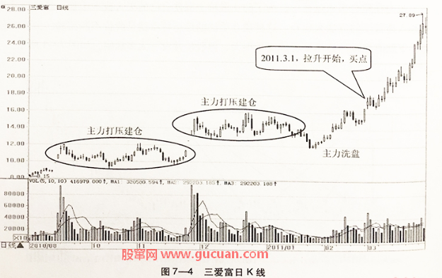 当两次打压建仓形态完成后,主力已经吸足筹码,此后股价经过小幅洗盘后开始持续上涨。2011年3月1日,股价突破前期高点,这说明拉升行情开始,此时买点出现。