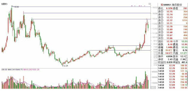 它已经突破了前期的高点,主力用资金的实力证明了,它可以突破之 前的高点位置,愿意解放前期的套牢盘,那么意味着什么??它的目标比之前还要高,对吗?明白了这个之后,那么,如果再有回踩前期高点的时候,我们要怎么们???不买入还等什么呢? 再看一下,我们熟悉的600851海欣股份,在什么位置要注意什么???一眼就能看明白了吧??