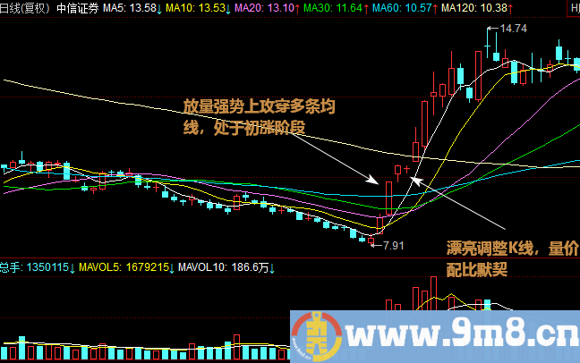找好大盘的入场点后,我们来寻找板块和个股,通过对当时暴涨期间的板块和个股观察发现,证券业板块里的中信证券(600030) 满足各项条件,首先其属于大盘股,其次其上涨力度较大且处于开涨阶段,最重要的一点是此股回靠均线K线组合非常漂亮,量能配合也很默契,因此最终将此股作为追击对象,追击点定在此股回靠均线后继续走强上穿120日均线的瞬间。