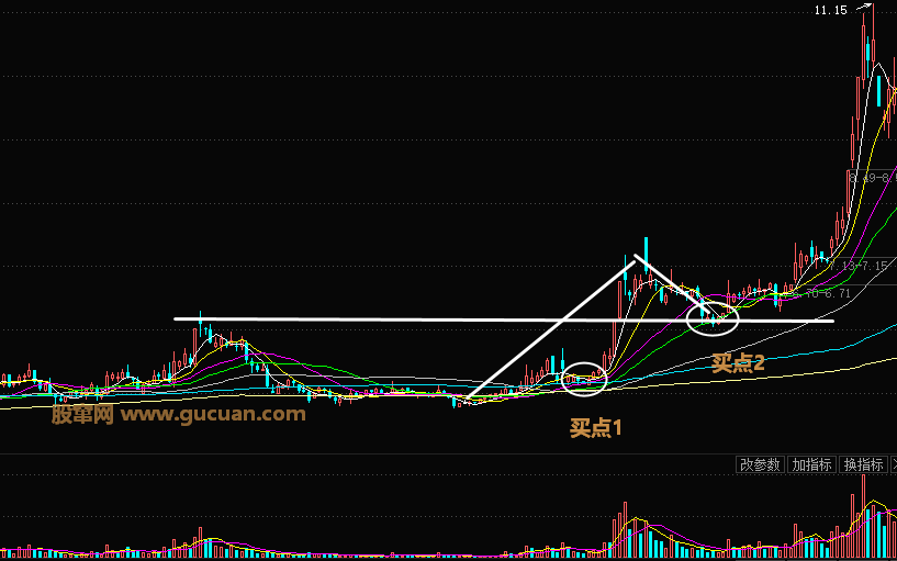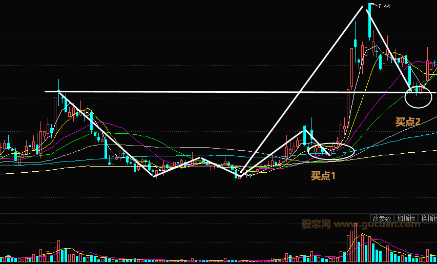 那么横盘整理下的买点在哪?在图2中我们同样 样标示了买点, 也给出了压力 线。为了更能说明问题我们对 买点一 进行了放大, 如图2所示。