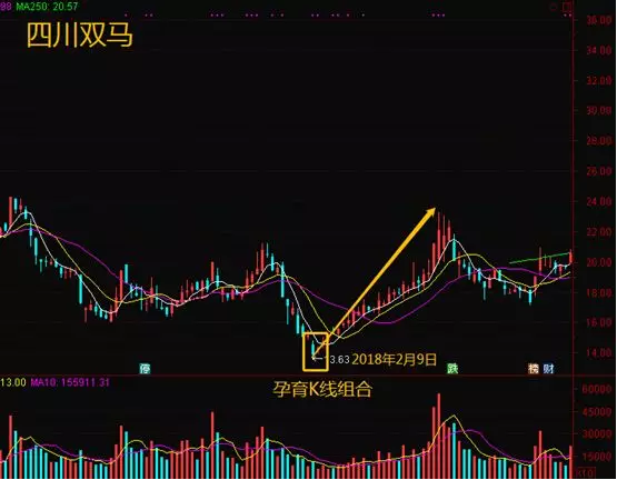四川双马股价连续下跌后,在2018年2月9日收出一个大阴线,第二天形成孕育线K线组合,底部见底的信号,之后股价大幅拉升。
