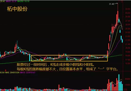 (1)股票经过一段时间后,K线走成多根小阴线和小阳线。每根K线的涨跌幅度都不大,且位置基本水平,组成了 一 字平台。