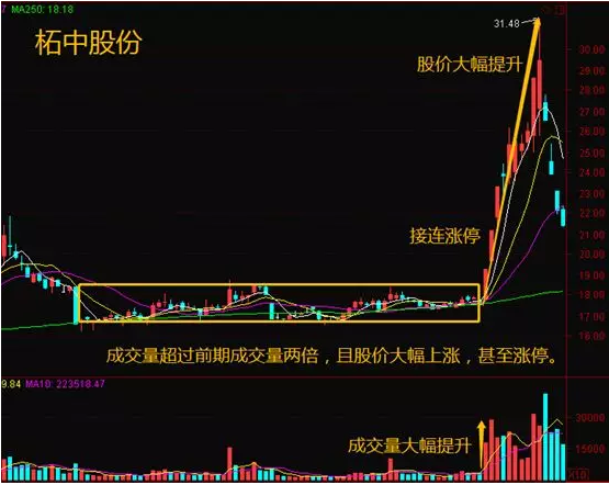 (2)突然有一天,股价放量上涨,这天的成交量超过前期成交量两倍,且股价大幅上涨,甚至涨停。