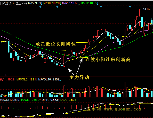 如图2,理工环科(002322),经过一波下跌以后直接放量长阳穿过多条均线,属于主力异动,随后在长阳上沿小幅整理后,再次出现串阳走势且突破长阳高点,属于主力再次异动,预示还有新高出现。