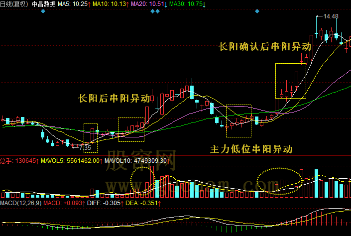 如图3,中昌数据(600242)第一次串阳出现在长阳后面,显示主力稍作休息拉升。第二次串阳出现在调整以后的相对低位属于主力异动等待长阳确认拉升。