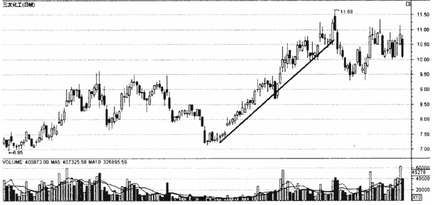 泛海建设(000046)在2007年上半年形成一轮强劲的持续上涨行情,我们可以在其上涨过程中沿前两次回调的低点画出一条 上升趋势线 ,当股价再度回落到这条趋势线附近时可以酌情买进,后来该股果然给了一次这样的机会,并于第三次触及 上升趋势线 后形成加速上涨(如图4一28中所示);