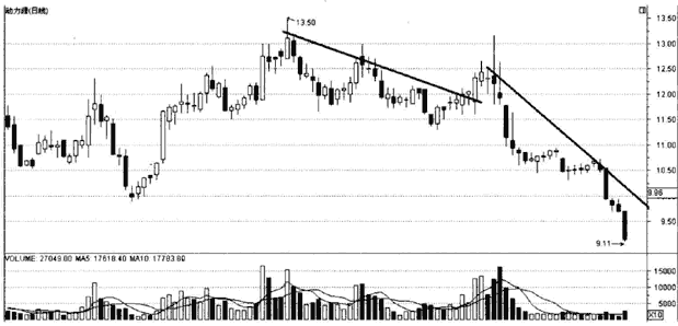 所谓下降趋势线,是指股价在下跌的过程中,一个高点比一个高点低,将其中的两个高点连接起来的一条趋势线,反映股价的下跌趋势。下降趋势线的图形见图4一6所示。