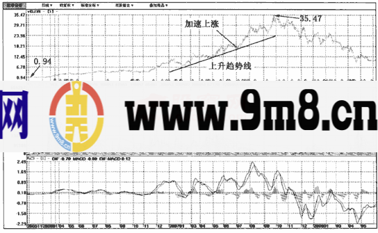 在实际操作中,慢速上升趋势线出现在以慢速上升趋势线为主的快慢趋势线组合中,其维持时间比快速趋势线长。而且,慢速上升趋势线揭示了股价(指数)运行的中长期趋势是向上的.具有中长期支撑股价(指数)上升的作用。只要股价(指数)一直在慢速上升趋势线上方运行,就应该坚持以做多为主,采取持股待涨的策略。此外,对于稳健型投资者来讲,可以选择在股价回落到慢速趋势线上方再次涨起来的时候跟多,下破止损。