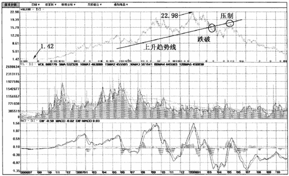 武钢股份(000005)于2007年的上涨行情中,形成两个重要的低点,我们可以据此画出该股的 上升趋势线 ,将来股价再次回落到此线上方时,如果得不到其有效的支搏,也就意味着该股的上升趋势已经完结,并会由此步入下跌趋势。后来该股在向下回落时,果然跌破了该 上升趋势线 。再后来该股于 上升趋势线 下方形成反弹,但趋势线原有的支撑作用已变成阻挡作用,该股在受到反压后,一路阴趺不止(如图4一30中所示)。