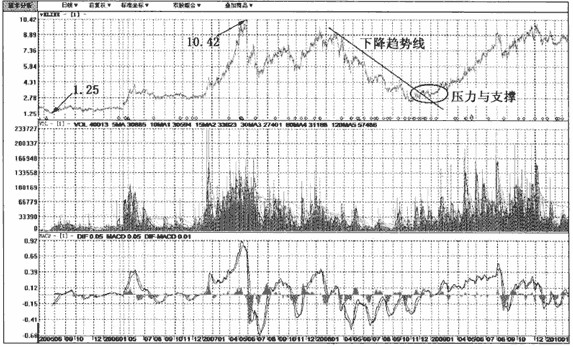 浙江富润(600070)的股价在2008年3~11月,一直在 下降趋势线 的压制下不断走低,但在11月末该股再次向上触及该趋势线时,不但没有再度回落,反而形成有效突破,这也意味着该股长久以来的下降趋势已经结束:后来这条原本压制该股下行的 下降趋势线 反而转化成了该股上涨的有力支撑(如图4一31中所示)。