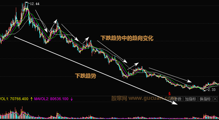 (2)下跌趋势(趋向)。下跌趋势是指价格整体保持一种向下运行的态势。如图所示,价格整体保持下跌趋势,其中趋向变化非常频繁,并且方向并不一定与下跌趋势一致。