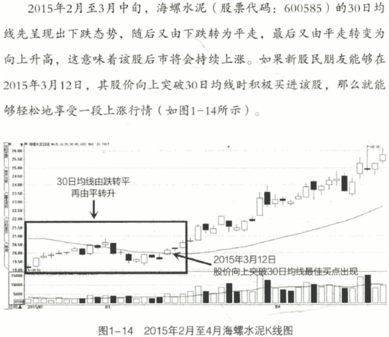 (5)一只股票的移动平均线经过一段时间的向下运行后,开始由跌势转为平走,最后转为上升,当股价突破移动平均线的时候就是一个比较好的买入点。