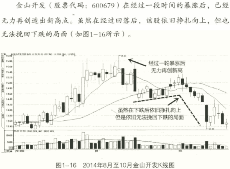 (2)股价在经过一段暴涨行情后,无法再次创出新高,虽然之后会有两三次涨跌,但是后市很有可能会出现下跌,此时最佳的选择就是卖出持股,离场观望,等到确定后市依旧有套利机会时再进场操作。