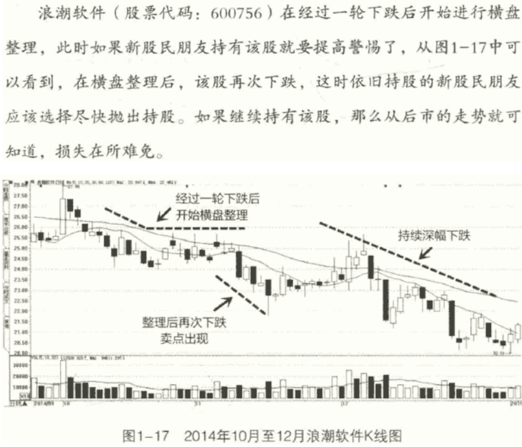 (3)股价在下跌之后开始进入横盘整理阶段,如果在横盘后股价依旧下跌,那么新股民朋友应该迅速抛出手中的持股,否则很可能会在后市蒙受巨大的损失。