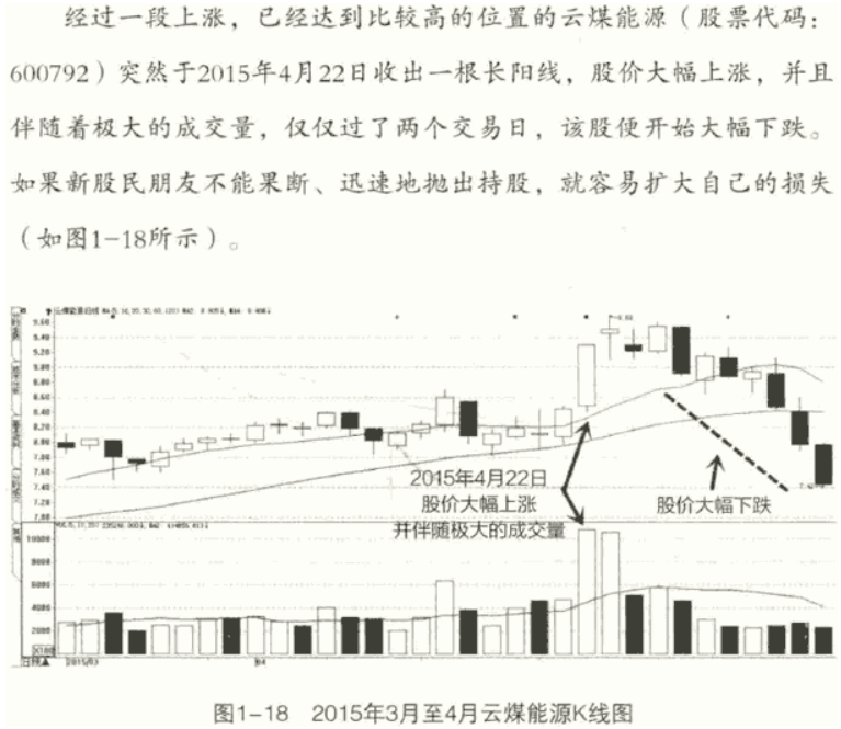 (4)如果一只股票已经上涨到了一个比较高的位置,突然在某一天收出一根长阳线,并且伴随着极大的成交量,那么新股民朋友最好在第二个交易日就迅速出局。