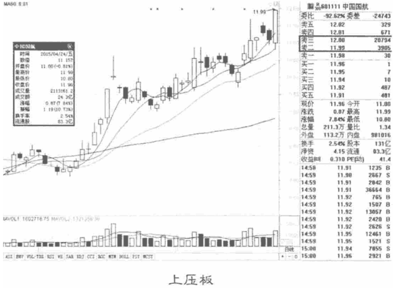 当股价处于刚启动不久的中低价区时,如果出现了上压板而股价却不跌反涨,则主力压盘吸货的可能性较大,这种现象往往是股价上涨的先兆,当交易者发现上压板被撤掉或被大口吃掉时,则要考虑跟进了。