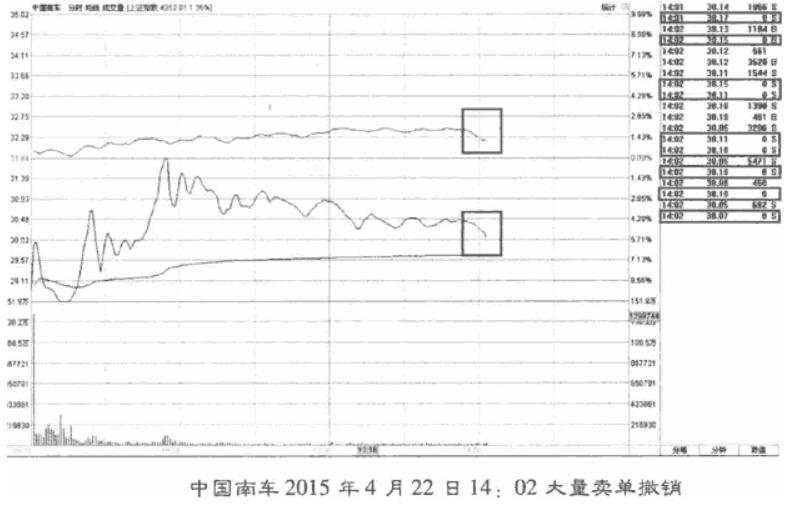 撤单是常见的盘口现象,每只股票几乎每天都会发生,有的是散户自发的撤单,是正常交易;有的是主力刻意撤单,是虚假申报。下图为中国南车的个股分时图,2015年4月22日14:02时,因大盘趋势向下调整,中国南车大量卖单撤销。