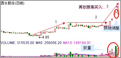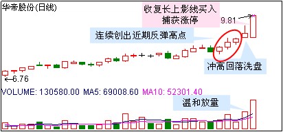 三、当股价攻破长上影阳K线高点后,伺机买入。主力成功洗盘后,次日开盘即快速拉升,盘中成功攻破长上影线高点后,就是绝佳买入时机。如华帝股份,上周四早盘冲高回落后,给人一种短线调整的感觉,而次日低开后即快速翻红,并再创近期新高,这就是绝佳的买入时机。