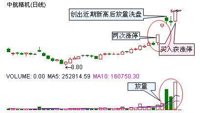 三、短线强力吸盘后,股价再度翻身向上时买入。一只股票的拉升,通常不会一蹴而就。一方面,短线资金会有较强的获利出局意愿,制约了股价的进一步走高;另一方面,主力也清洗浮筹,为后续拉升做准备。而股价再度翻身向上,则说明短线洗盘结束,新的拉升就此展开,兔宝宝和中航精机基本都是这样的走势。
