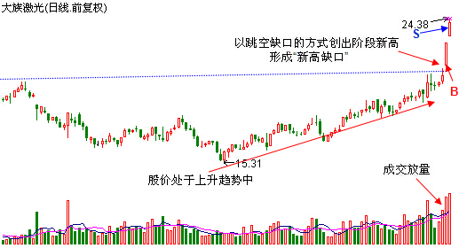 2、出现缺口当日,股价开盘即展开强劲拉升... 操盘技巧:巧用新高缺口获涨停操盘技巧:巧用新高缺口获涨停