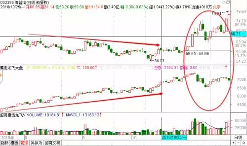 002399,海普瑞,2010年10月25日的分时盘口。主力通过五档小单来观察盘中异动,卖二的位置甚至出现了价格断档,这说明主力不放单在那基本就没人卖了,这种筹码锁定度是非常高的,行情离启动应该不会太远。启动的标志是量价突破形态来确认,该股后面明显强于指数上涨。
