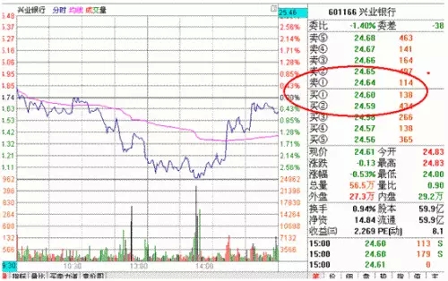 上图是2010年11月10号工商银行的盘口,卖一和买一的单数对比是19比1,当天多空力量对比比较悬殊,在分时量能没有异动前,这种弱势将维持下去,是明显的空方占优的盘口。