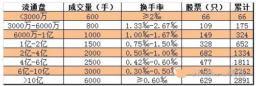 6、流通盘在4亿~6亿之间,集合竞价成交量在2500手以上,目前两市流通盘在这个范围的股票一共有477只,4亿以下的一共有1334只;