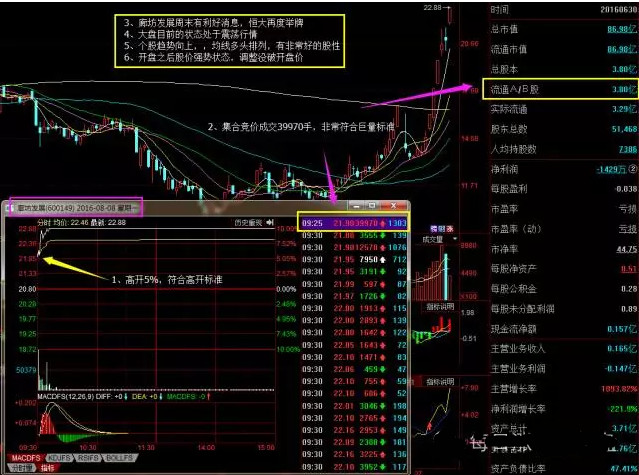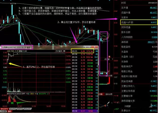 好了,做个总结:根据集合竞价高开巨量这个条件来选股的话,平时比较常见,也具有可参与性的个股,一般都是开盘价在3%~7%之间,流通盘一般都要小于6个亿。并且建议打板,而不是赌半路板,当然,半路板风险大赌对了肉也多。
