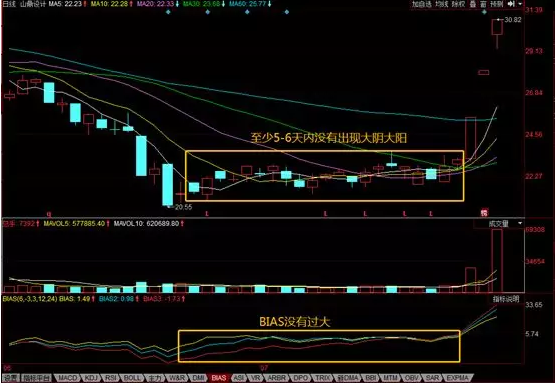 股票应经过较长时间震荡盘整,走势才趋于平稳。盘整要求至少5~6天内没有出现大阴大阳,均线系统不能出现BIAS太大的情况,拉到涨停的位置后离强阻力区域不能太近,要给第二天的高开留下一定的空间。