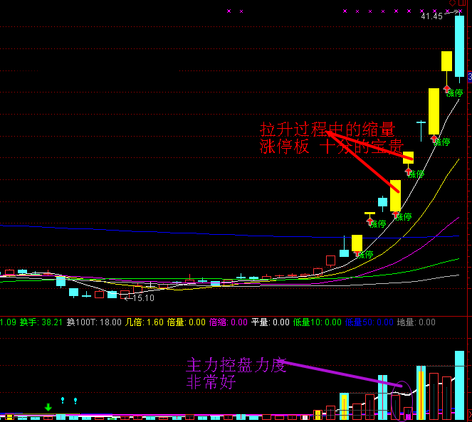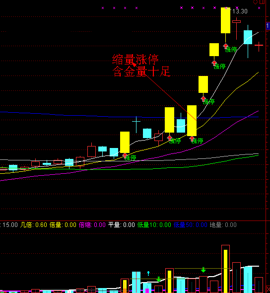单根的K线缩量并无重大的意义,但是当缩量和涨停板联系起来,意义就非凡了;涨停缩量,说明该涨停拉升的单子都打在空盘上,主力控盘较高,后面还会有连续的涨停出现。