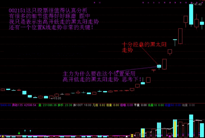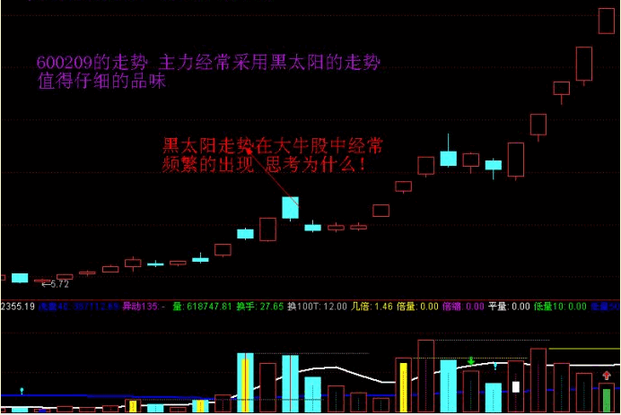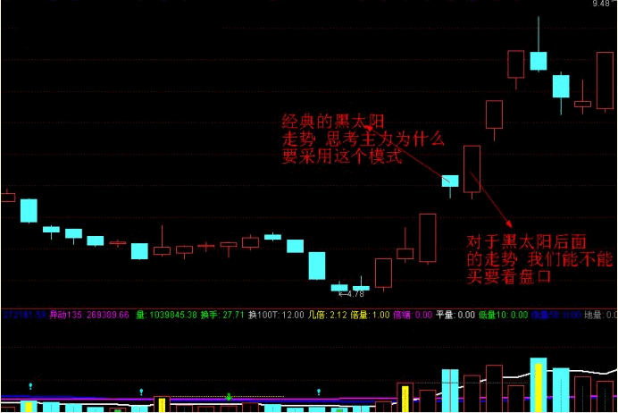 该形态常见于上榜龙虎榜的股票,给人一种出货的感觉,但只要这种 黑太阳 升起来,后面就能收获利润的曙光。